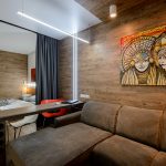 Terdapat satu lagi ciri yang mesti diperhatikan - kehadiran pintu, akses yang mesti percuma. Dengan keperluan untuk menarik kembali tirai, sukar untuk menjaga estetika yang betul di dalam bilik.