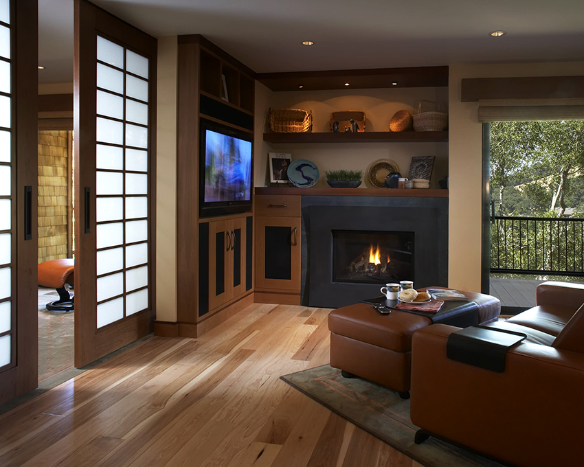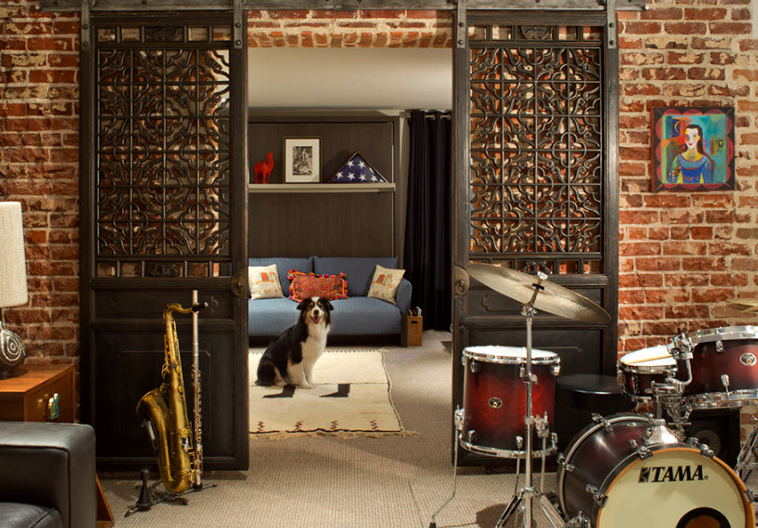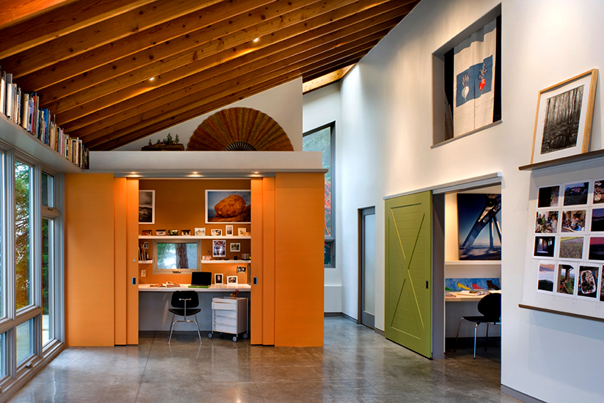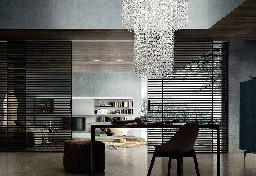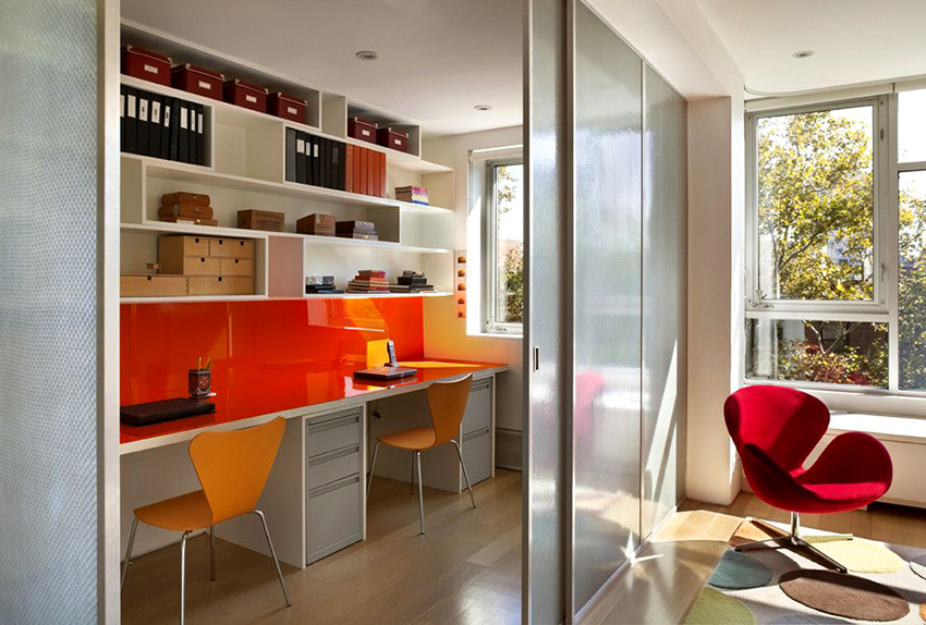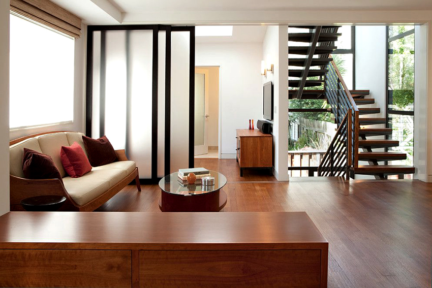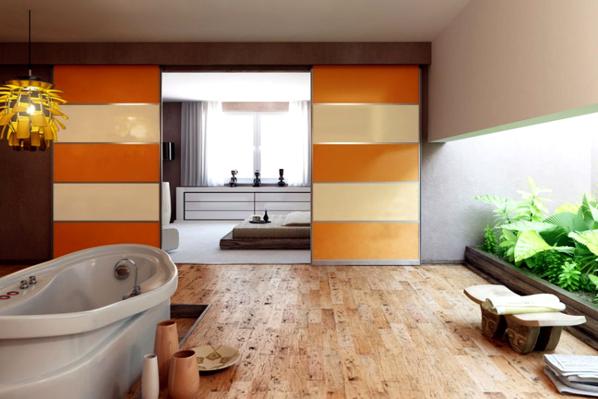 Sekiranya anda ingin membuat reka bentuk yang asli dan tidak standard, anda boleh memasang pintu gelangsar kaca berwarna dengan struktur sudut di dalam bilik. Ia kelihatan hebat di kawasan pedalaman dan bagus untuk mengezon ruang, terutama di pangsapuri studio.