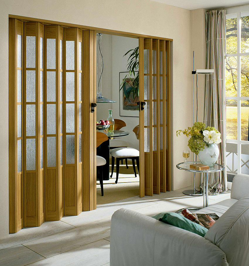 Jenis pintu gelangsar-lipat mempunyai beberapa bahagian. Secara luaran, reka bentuk seperti itu menyerupai akordeon. Model sedemikian tidak dapat mengasingkan ruangan sepenuhnya dari bunyi dan bau yang tidak menyenangkan, oleh itu model ini sering digunakan sebagai partition gelongsor di bilik untuk mengezonkan ruang atau menghiasi bahagian dalam.