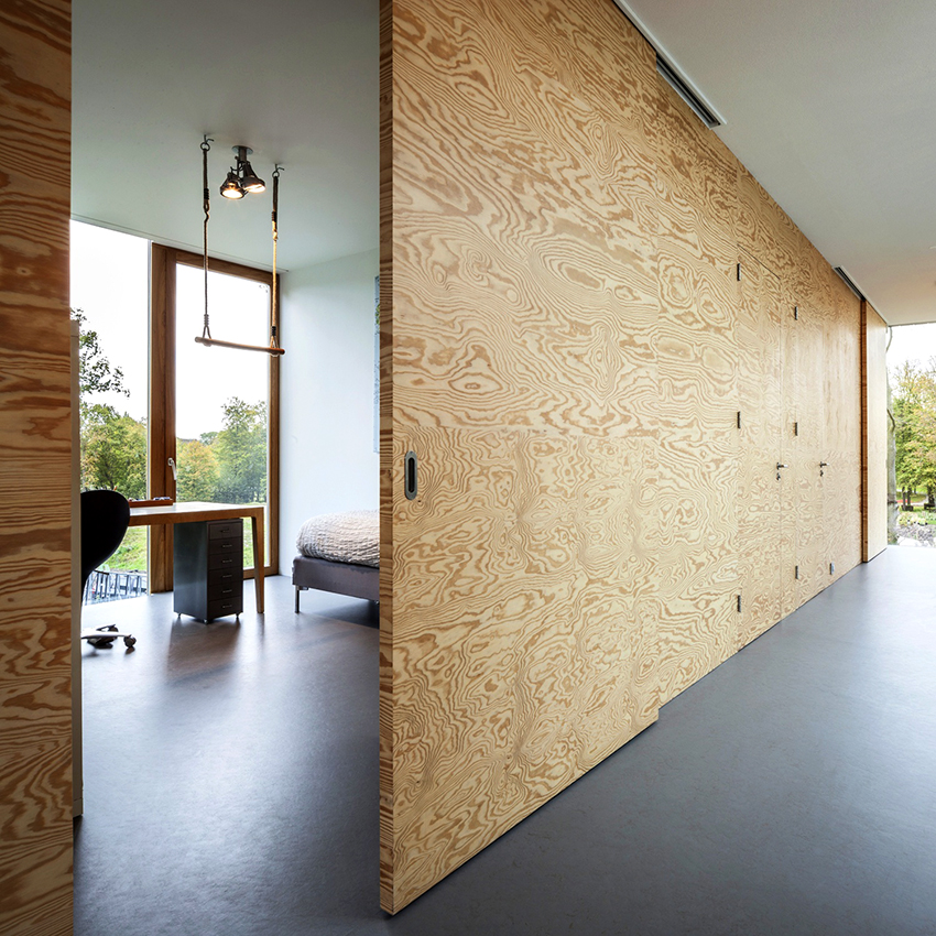 Dalam reka bentuk pintu petak daun tunggal, daunnya dipindahkan ke satu sisi yang selari dengan dinding