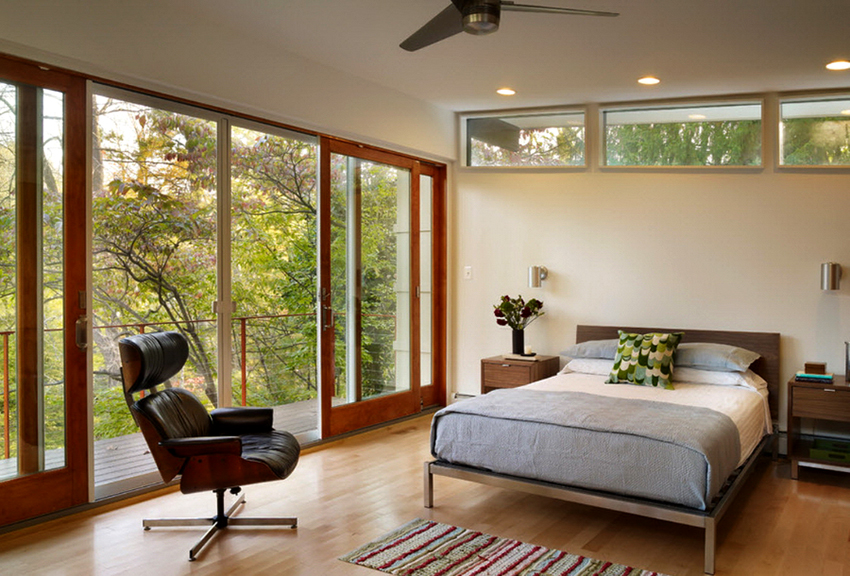 Lebih baik membeli model dengan reka bentuk yang elegan sebagai pintu gelangsar ke bilik tidur. Perlu memberi keutamaan kepada struktur kaca dengan permukaan legap, dihiasi dengan gaya klasik. Untuk bilik yang luas dengan kawasan yang agak besar, bahagian dalamnya dibuat dalam gaya moden, model telus tanpa bingkai sangat sesuai. Pintu-pintu ini sesuai dengan bilik tidur minimalis.