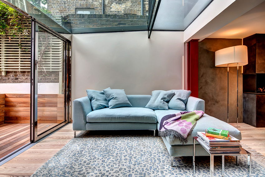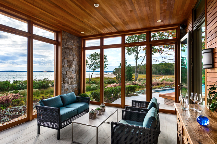 Dalam struktur beranda aluminium gelongsor, profil diletakkan sangat rendah, memberikan pandangan seluas mungkin. Di samping itu, sistem seperti itu tidak menghalang aliran udara segar.