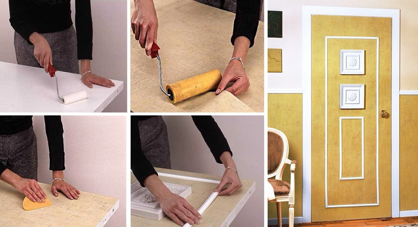 Sebidang ukuran yang diperlukan dilekatkan pada permukaan pintu menggunakan gam kayu PVA, yang diaplikasikan terus ke daun pintu. Kertas dinding ditekan pada produk dan diratakan dengan roller atau kain, mengeluarkan gelembung udara.