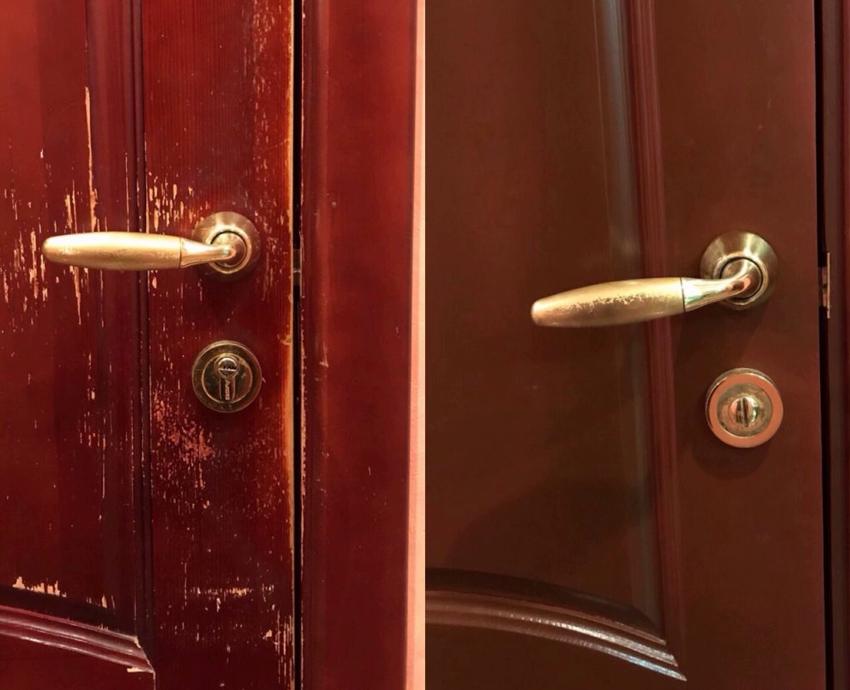 Goresan yang kelihatan dan kerosakan kecil yang lain dapat muncul di permukaan pintu venir. Anda boleh menyembunyikan kecacatan dengan lilin cair, warnanya harus sesuai dengan warna kemasan. Permukaan hendaklah dikasar sedikit, kemudian dilenyapkan dan diisi.