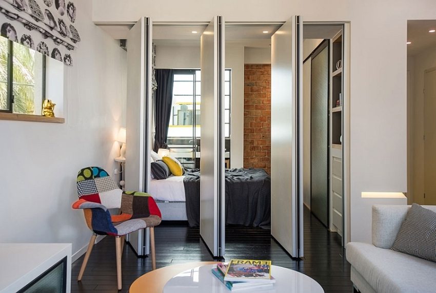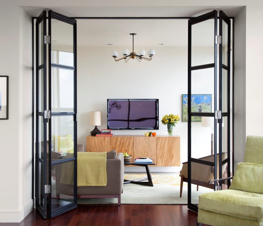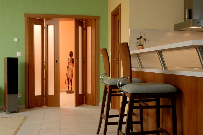 Melipat pintu jangan mengambil banyak ruang. Mereka boleh dipasang walaupun di pintu yang tidak standard dan sempit, di koridor sempit, di bilik mandi, di bilik persalinan... Selalunya, pintu yang dilipat dan pintu akordeon digunakan sebagai sementara partitionapabila ada keperluan untuk membahagi ruang menjadi zon berfungsi.