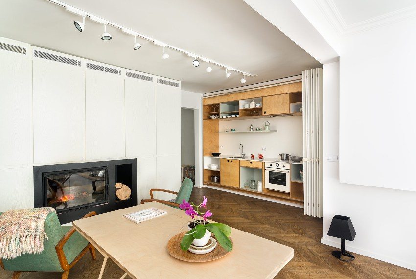 Tidak seperti pintu berengsel standard, pintu lipat lipat tidak memakan banyak ruang dan membolehkan anda menjimatkan ruang dengan ketara. Semasa menutup dan membuka, ia bergerak ke depan hanya selebar satu bahagian dan tetap berada di ambang pintu. Ini menjadikannya tempat yang tepat untuk pangsapuri atau ruang tamu kecil. Terima kasih, walaupun di koridor yang paling sempit terdapat tempat untuk penyangkut, rak kasut atau almari pakaian yang ringkas tetapi lapang.