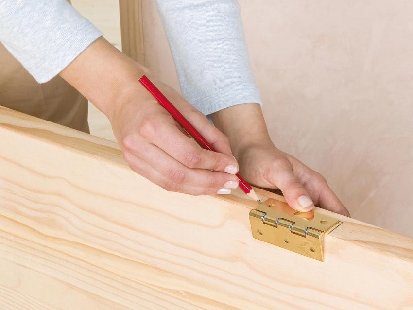 Pertama sekali, perlu memilih titik yang diperlukan di mana engsel akan dipasang. Seterusnya, bahagian digunakan pada tempat yang dikehendaki, penandaan dilakukan. Pensil biasa yang diasah dengan baik sesuai untuk menandakan. Setelah selesai menandakan, lapisan kayu harus dikeluarkan dari bahagian dalam pintu (di tempat-tempat di mana engsel akan dipasang). Ketebalan lapisan kayu yang akan dikeluarkan dikira dari ketebalan gelung.