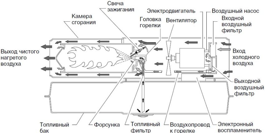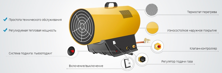 Permintaan untuk pemanas generasi moden ini meningkat pada musim pemanasan sekiranya sistem pemanasan daerah tidak tersedia atau tidak berfungsi dengan baik. Struktur melepaskan udara hangat ke dalam ruangan, yang terbentuk akibat pembakaran bahan bakar - gas.