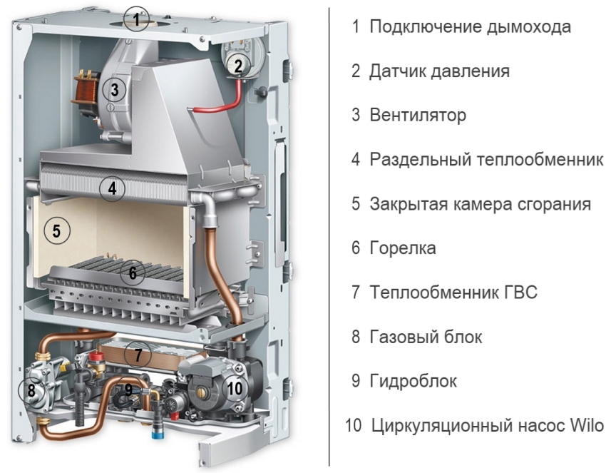 - Oleh kerana litar pemanasan perlu dipanaskan ke suhu yang lebih tinggi, penukar haba utama terletak tepat di atas sumber haba, yang merupakan pembakar gas.
