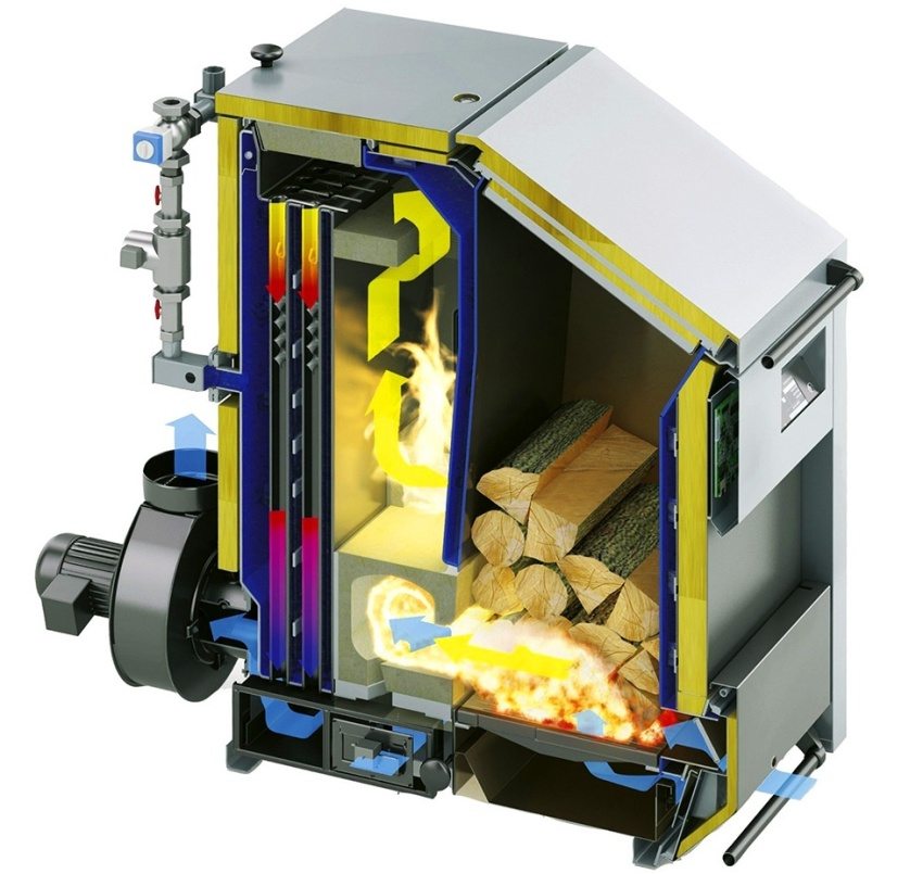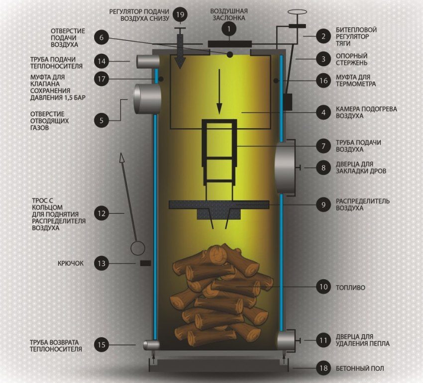 Pembakaran perlahan bahan api pepejal berlaku di ruang bawah. Ia dicapai dengan menyesuaikan bekalan udara ke blower. Gas yang dikeluarkan membakar secara intensif di ruang atas dan memanaskan penyejuk.