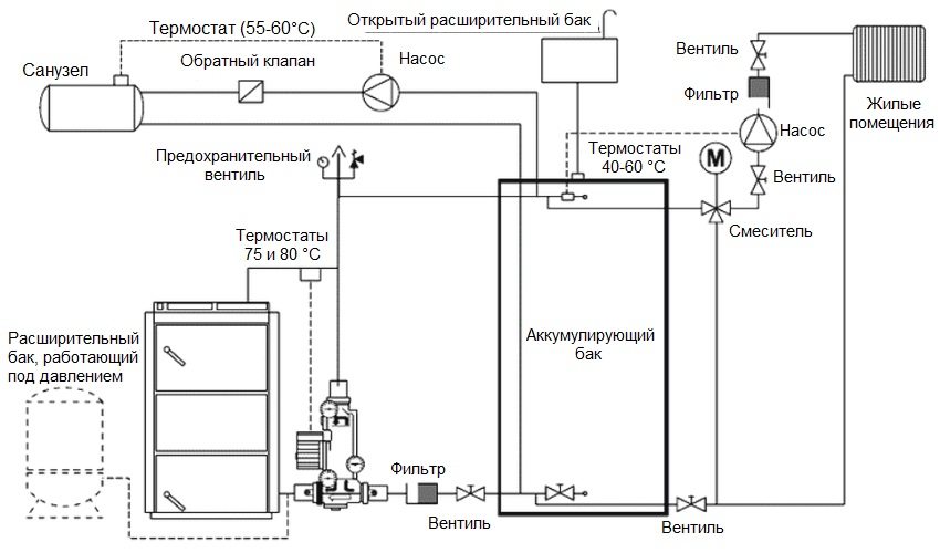 Rajah menghubungkan dandang bahan api pepejal ke sistem pemanasan