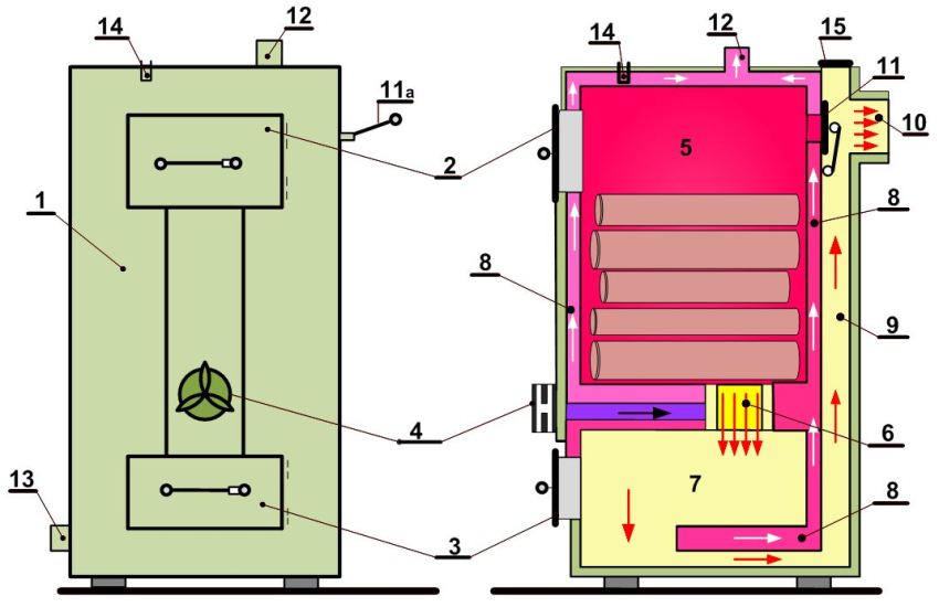 Rajah penjana gas buatan sendiri dengan bekalan udara paksa ke zon pembakaran: 1 - badan dandang; 2 - pintu pemuatan; 3 - pintu panci abu; 4 - kipas yang membekalkan udara ke zon pembakaran; 5 - ruang pemuatan dan zon pembakaran bahan bakar utama; 6 - lubang teknologi untuk membersihkan saluran cerobong; 7 - ruang pembakaran gas kayu; 8 - jaket penukar haba; 9 - saluran keluar gas serombong; 10 - leher saluran keluar cerobong; 11 - gerbang penyesuaian cerobong (11а - pemegang pintu); 12 - jalan keluar ke saluran paip pengedaran; 13 - paip balik melalui penyejuk yang disalurkan dari sistem pemanasan; 14 - lengan unit kawalan (termomanometer); 15 - Lukas untuk membersihkan saluran asap