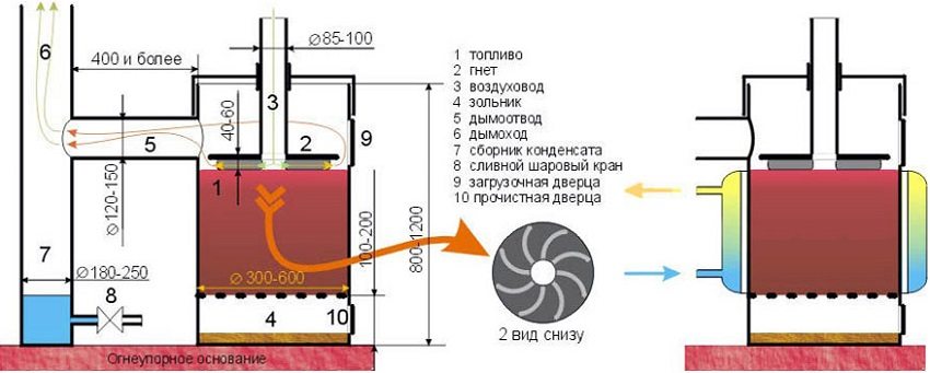 Saiz kerja dari firebox dandang dengan kayu untuk memanaskan rumah (kawasan 80 m2, kayu bakar birch) ialah 0,7x0,6x0,5 m. penyingkiran gas serombong.