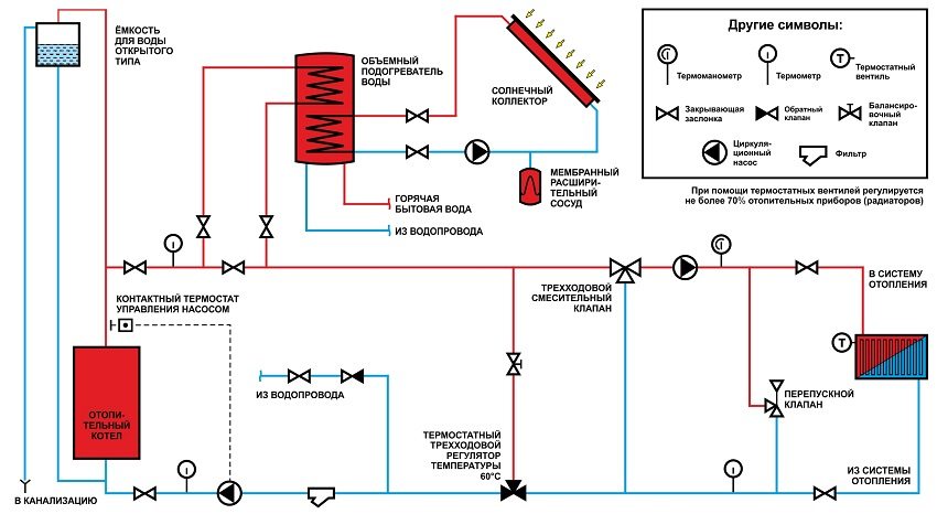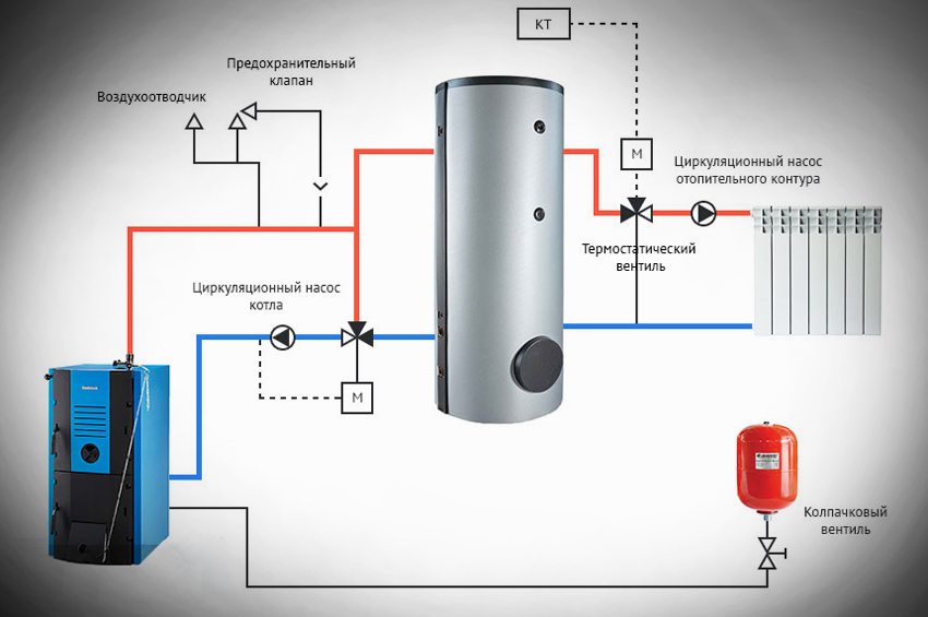 Paip bekalan penyejuk ke sistem pengguna terletak di bahagian atas. Kembalikan paip sambungan - bawah. Penyejukan pembawa haba balik di bawah 65 ° C berbahaya bagi kondensat asid yang jatuh di dinding penukar haba, yang merosakkan keluli. Dengan keluaran dandang yang rendah, suhu antara aliran dan garis pemulangan disamakan dengan memasang injap pintas. Litar dandang rumah besar dilengkapi dengan unit lif dan pam edaran.
