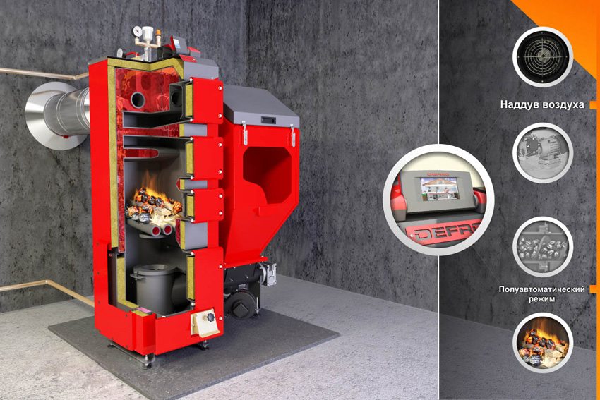 Badan dandang dikimpal dari keluli lembaran berdinding tebal (4 ÷ 5 mm). Pemuatan kayu api adalah bahagian depan. Sinaran termal dipindahkan ke atap dandang, dinding sisi ruang dan memanaskan udara memasuki zon pembakaran. Keketatan dan keketatan ruang pembakaran dipastikan oleh rana dengan reflektor dan bolt putar pada muatan dan palka abu. Udara dibekalkan ke ruang pembakaran secara paksa oleh kipas.