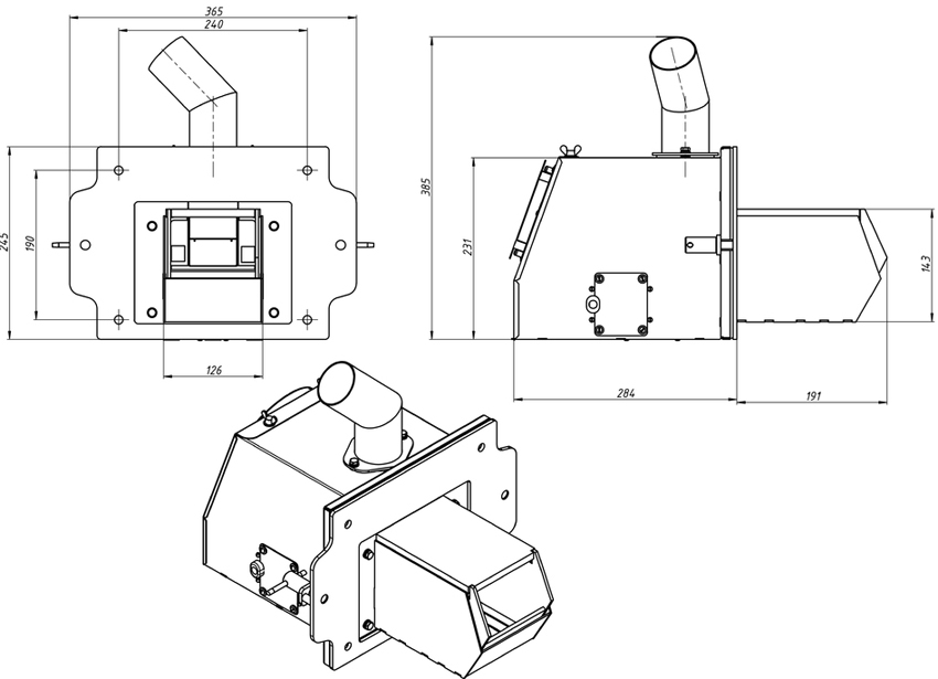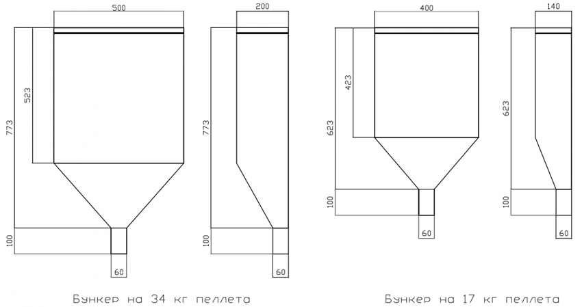 Dimensi hopper dipinjam dari mana-mana model yang sesuai (contohnya, Pelletron 15). Pembakar pelet merangkumi saluran udara sekunder, yang paling baik dilakukan dalam bentuk huruf "L". Ini akan meningkatkan kecekapan peranti operasi dengan ketara.