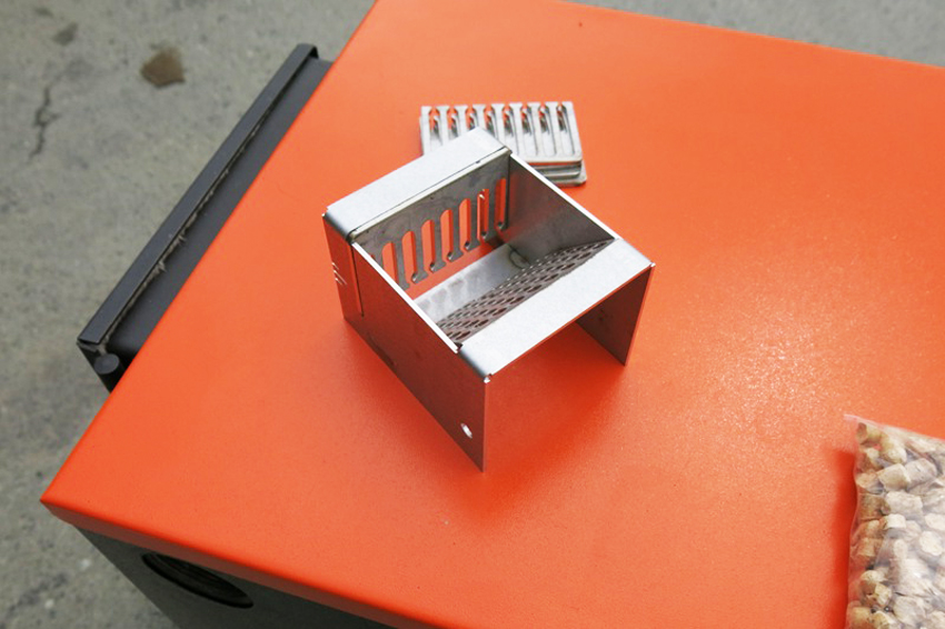 Unsur struktur yang paling kritikal yang merupakan sebahagian daripada pembakar pelet adalah bakul. Semasa membuat elemen seperti itu sendiri, harus diingat bahawa ada satu masalah umum - pelekat butiran di dinding belakang, yang condong dan mempunyai slot. Untuk menyelesaikan masalah, anda perlu membuat slot dengan cara yang berbeza. Pilihan standard membolehkan slot yang kukuh, tetapi struktur yang lebih selular adalah disyorkan.