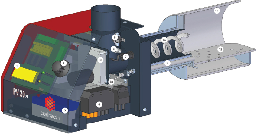 Peranti pembakar pelet, di mana 1 - paparan LCD, 2 - tombol kawalan, 3 - bateri sandaran, 4 - soket penyambung, 5 - sensor tahap bahan bakar, 6 - termostat keselamatan, 7 - sensor foto, 8 - motor auger dalaman, 9 - penyala , 10 - auger dalaman, kotak api, 11 - parut pembakaran, 13 - kipas