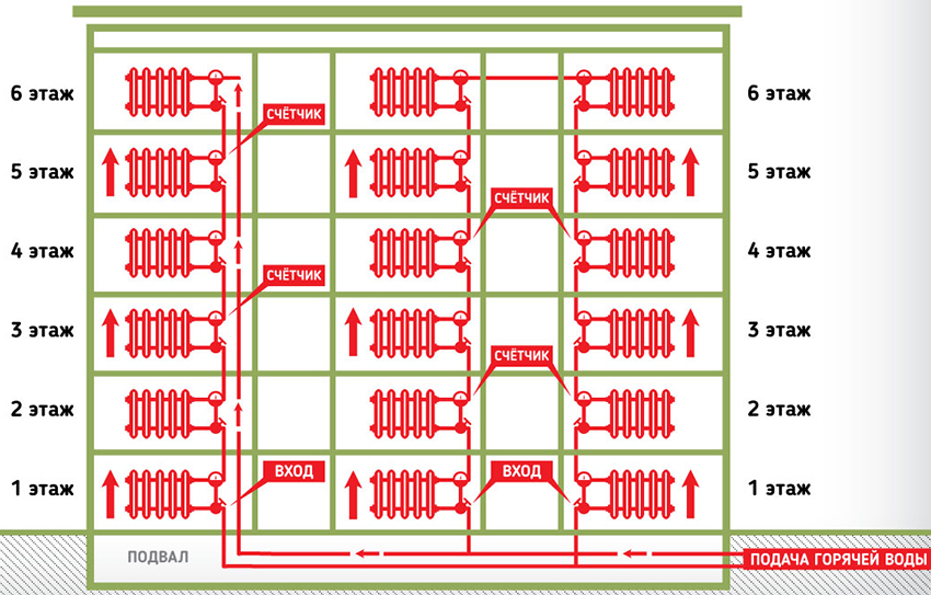 Bangunan bertingkat boleh mempunyai salah satu pilihan susun atur sistem pemanasan - menegak atau mendatar. Rumah-rumah yayasan lama, seperti rumah Khrushchev dan Stalin, terutamanya dicirikan oleh sistem pemanasan menegak. Dalam kes ini, litar pemanasan boleh menjadi satu atau dua paip. Walau bagaimanapun, aliran pembawa haba di sepanjang tahap antara lantai mempunyai urutan dari bawah ke atas dan atas ke bawah. Kelemahan utama susun atur menegak: