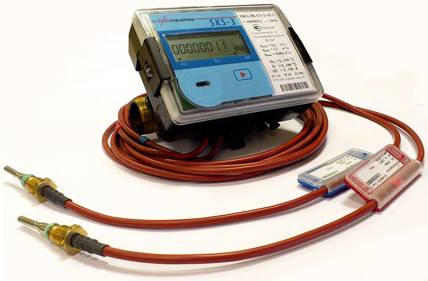 - Sensor aliran. Dipasang pada riser bekalan sistem pemanasan untuk mengira jumlah air yang digunakan yang melewati sistem untuk satuan masa yang ditetapkan.
