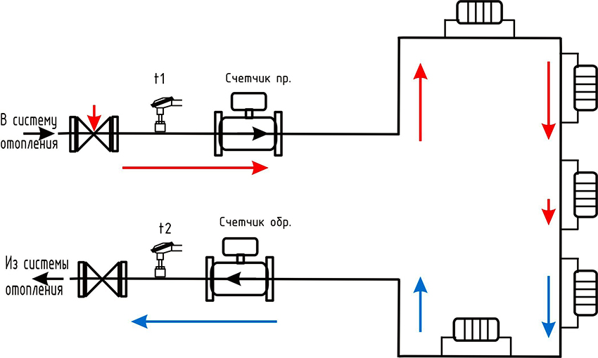 Dengan pendawaian mendatar, lebih mudah memasang meter pada bateri pemanasan. Dalam kes yang jarang berlaku, alat pemanasan dilekatkan pada garis pemulangan, tetapi dalam kes ini, pengiraan dilakukan mengikut prinsip yang berbeza.