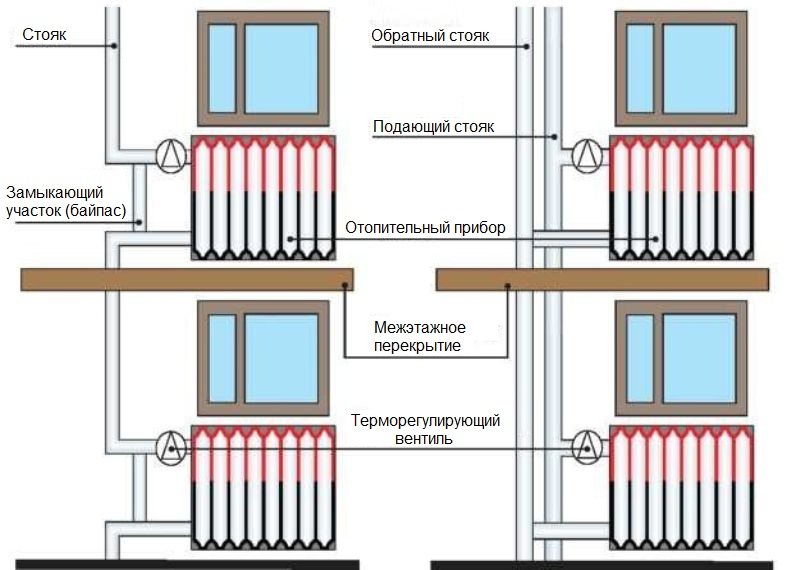 Dalam sistem dua paip, radiator disambungkan secara selari. Memutuskan satu bateri tidak akan mempengaruhi operasi yang lain. Pemintas tidak diperlukan di sini, dan termostat dengan rintangan hidraulik yang tinggi dapat dipasang untuk kawalan suhu yang berkesan.