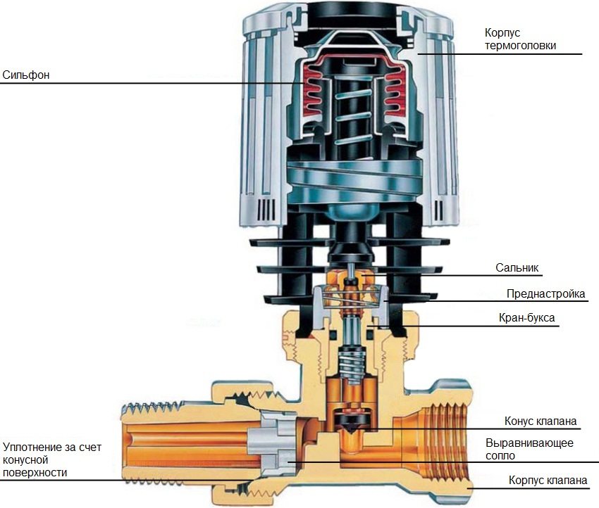 Ini adalah pilihan terbaik untuk perumahan moden. Mekanisme peranti terdiri daripada dua bahagian - kepala haba sensitif dan injap. Mereka saling berinteraksi tanpa penglibatan tenaga. Kepala termal (bellow) adalah silinder beralun berongga yang diisi dengan gas atau cecair.