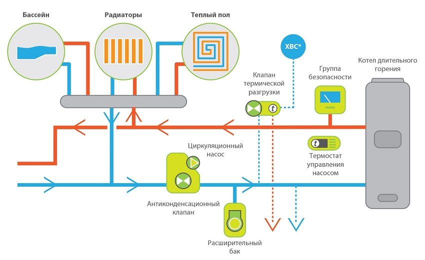 Gambarajah ringkas automasi penyambungan ke sistem pemanasan dengan dandang bahan api pepejal yang lama terbakar