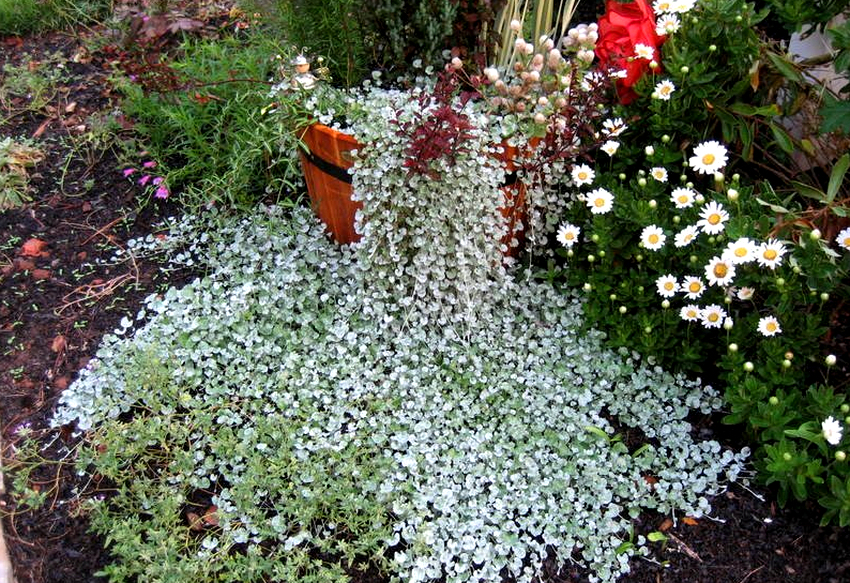 Selalunya, bunga ampel ini untuk pot (foto di Internet menunjukkan ini dengan jelas) digunakan dalam reka bentuk plot sebagai latar belakang yang memancarkan dan menekankan kecerahan tanaman berbunga lain. Beberapa dichondra, disusun dalam urutan tertentu, dapat membentuk khemah, lindung nilai dan angka volumetrik lain.
