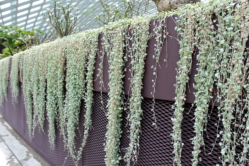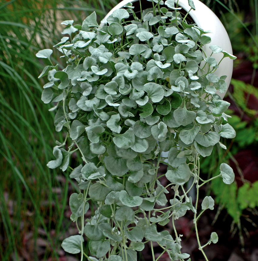 Dichondra ampelous: foto "air terjun", "latar belakang", "asas"