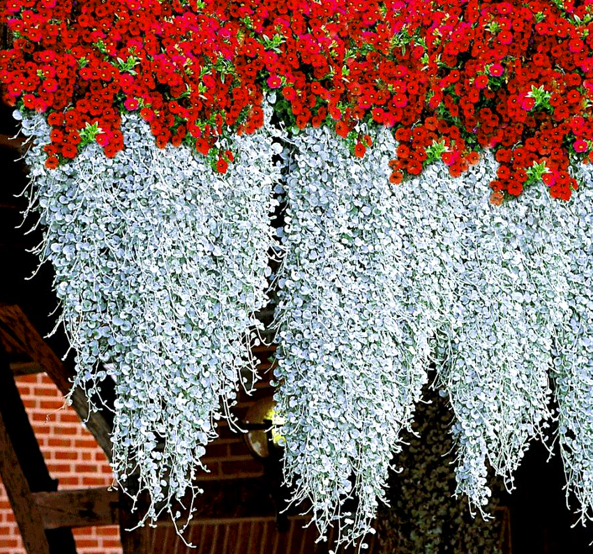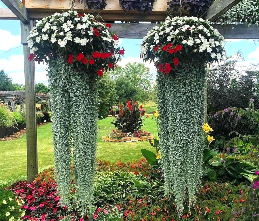 Keinginan untuk menghias dengan bunga tidak hanya bahagian tanah, tetapi juga tingkat atas laman web ini menyebabkan populariti pilihan periuk gantung. Dalam kedudukan ini, bunga yang paling sesuai untuk pasu tergantung. Jisim bunga yang mengalir menghasilkan kesan hiasan yang menarik.
