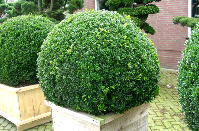Ini bukan untuk mengatakan bahawa pilihan tanaman globular sangat bagus. Varian yang paling biasa adalah thuja. Bola malar hijau yang ditanam di dalam pasu menghiasi lorong, fasad bangunan, pintu masuk ke gazebo, dan lain-lain. Terdapat juga beberapa jenis pokok renek hiasan yang ditanam di dalam bekas. Mahkota mereka dengan gunting dibentuk dalam bentuk bola.