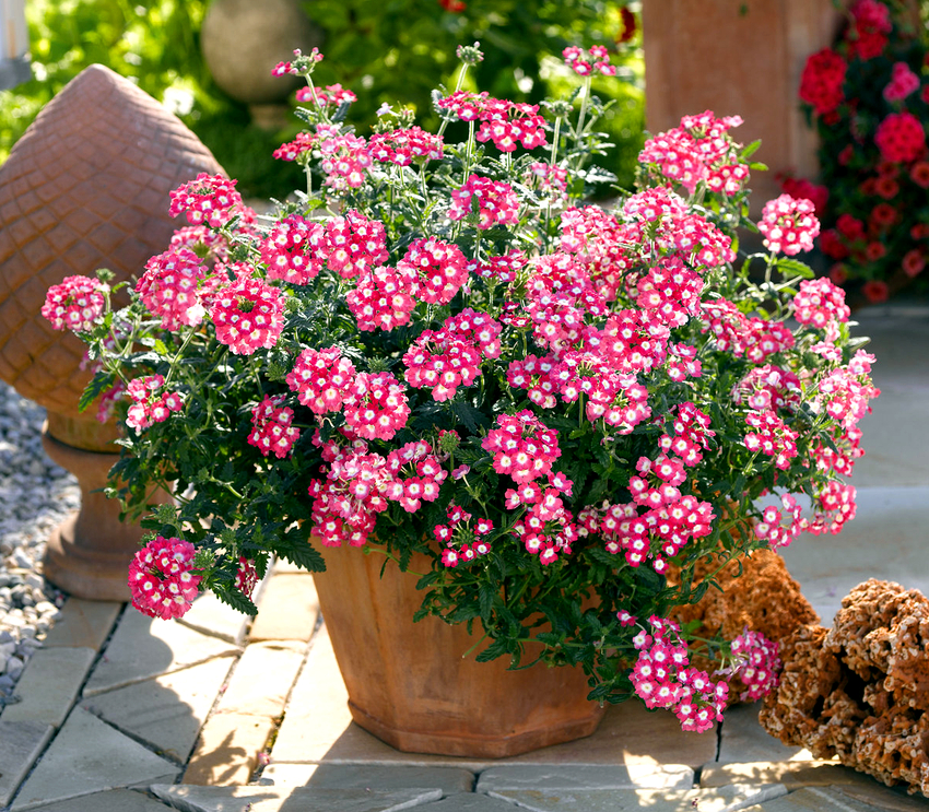 2. Verbena sangat dekat dengan kedudukan teratas. Rasanya cukup selesa di bawah sinar matahari langsung, penyiraman diperlukan sederhana, tetapi biasa. Tunas berbeza warna: putih, kuning, merah, biru.