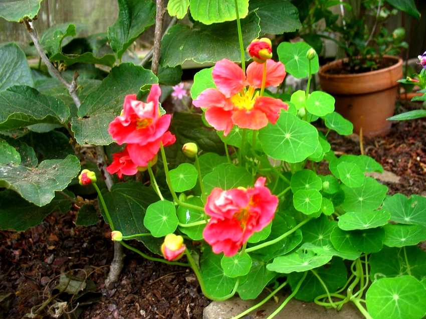 Tumbuhan dengan bunga ganda merah pekat diperoleh dengan menyeberangi nasturtium besar dan tiroid.