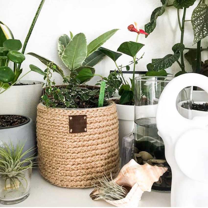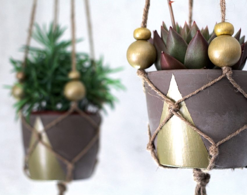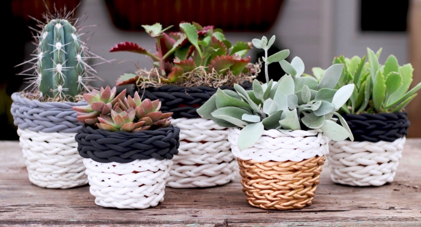 Untuk meningkatkan kesan hiasan, pot bunga harus dibungkus dengan sehelai kain goni atau kain lain, terpaku padanya dengan gam. Jalur jalinan dilekatkan dari atas dan diikat dengan selamat dengan hujung tali yang bebas.