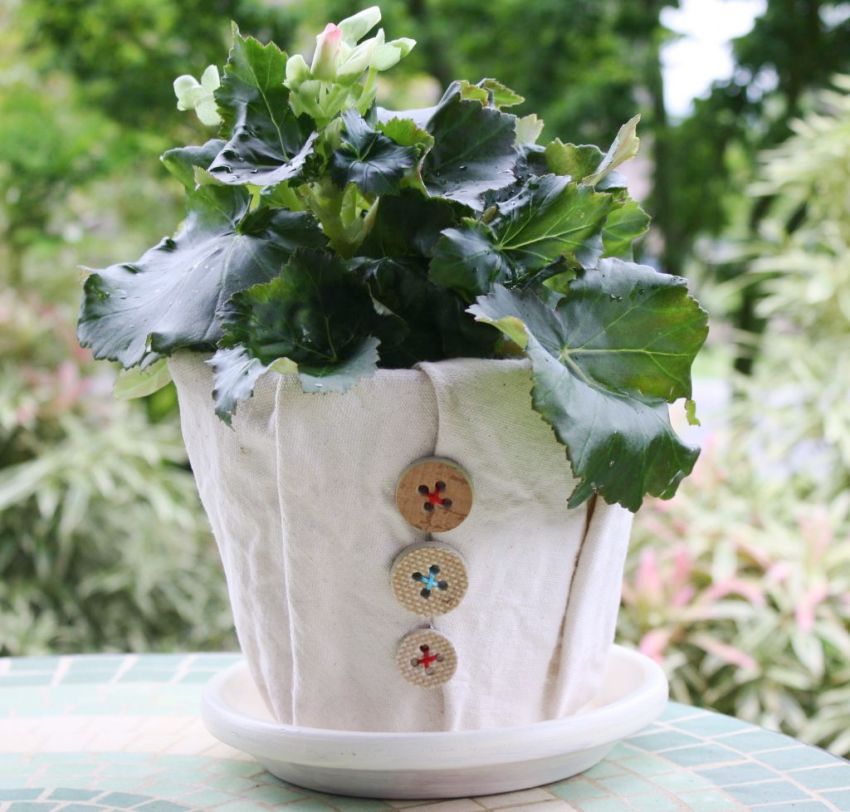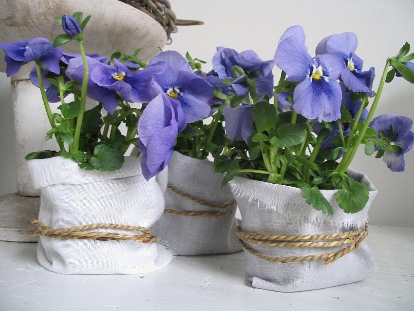 Pot bunga boleh ditutup dengan kain goni atau kain lain. Untuk ini, sekeping ukuran yang diperlukan dipotong, dengan pot bunga dibungkus. Anda boleh memperbaiki penanam kain seperti itu dengan tali atau pita.