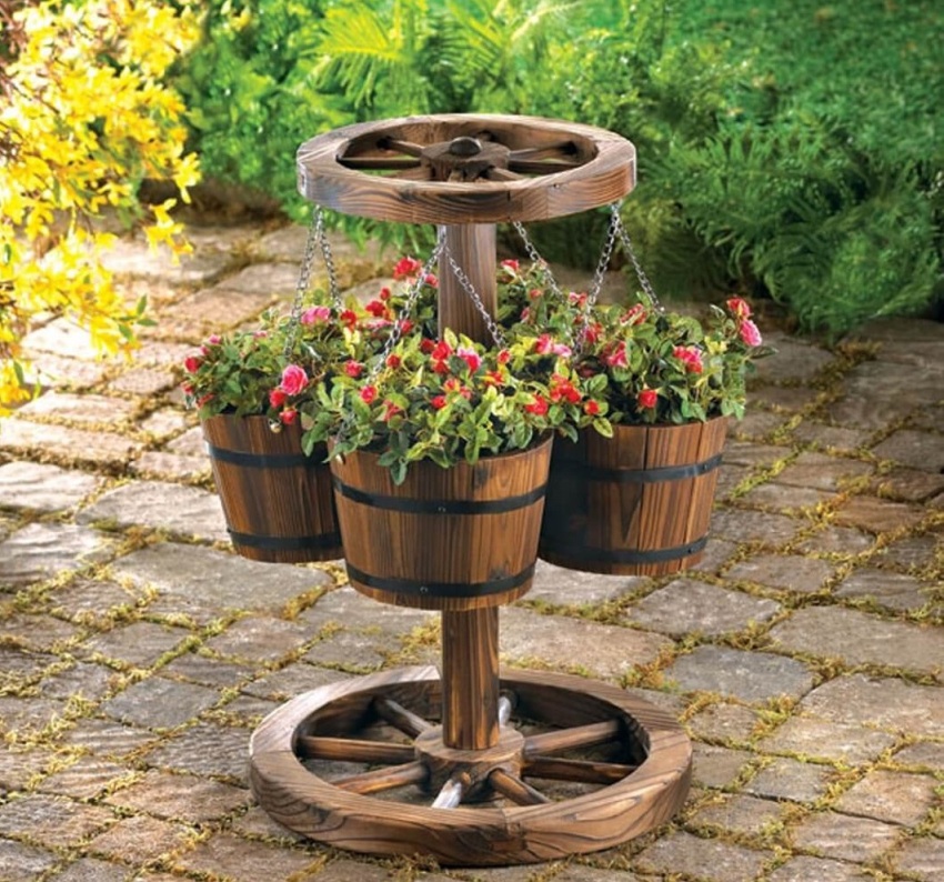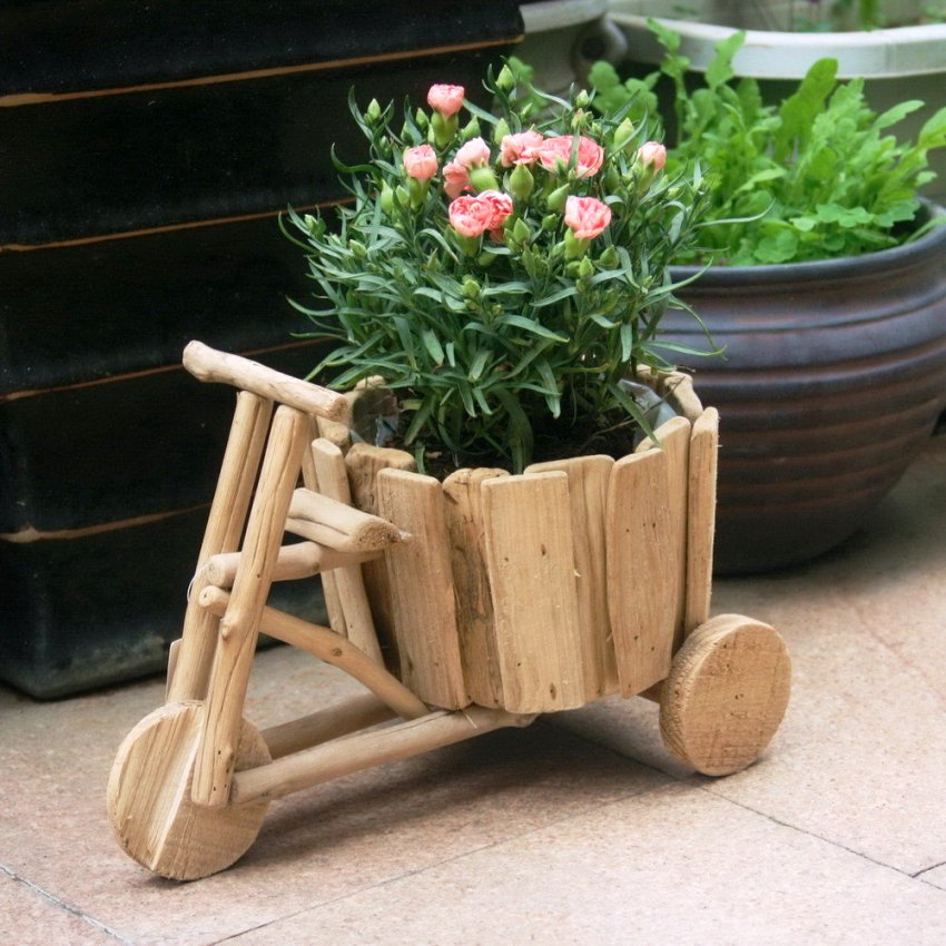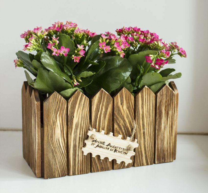 Kotak kayu dengan bentuk yang sesuai dapat digunakan sebagai penanam lantai untuk balkoni atau taman. Mula-mula mesti diampelas, dirawat dengan pernis yang tahan lembapan atau dicat. Anda juga boleh membuat produk dari bongkah kayu dengan panjang dan ketebalan yang sama, yang diletakkan dalam bentuk kotak persegi atau segi empat tepat dan dipasang dengan skru mengetuk sendiri.