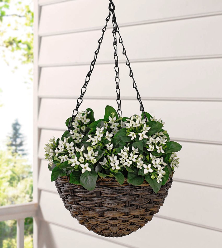 Pot anyaman berbentuk bulat atau segi empat tepat yang diperbuat daripada ranting willow atau pokok anggur kelihatan menarik dan bergaya. Anda juga boleh menggunakan benang rotan buatan untuk ini. Berbagai versi produk ditunjukkan dalam foto menggantung pasu bunga luaran.
