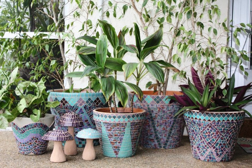 Penggunaan teknik mozek memberikan hasil yang luar biasa. Walau bagaimanapun, teknik ini memerlukan lebih banyak masa dan usaha. Oleh itu, anda boleh menghias dengan tangan anda sendiri periuk yang diperbuat daripada konkrit, simen atau plaster.