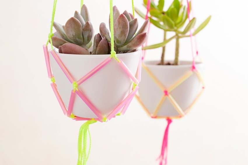 Penanam gantung buatan tangan yang diperbuat daripada jerami sangat sesuai dengan dalaman moden dengan sentuhan inovatif. Untuk kerja, anda perlu menyediakan benang dan jerami neon.