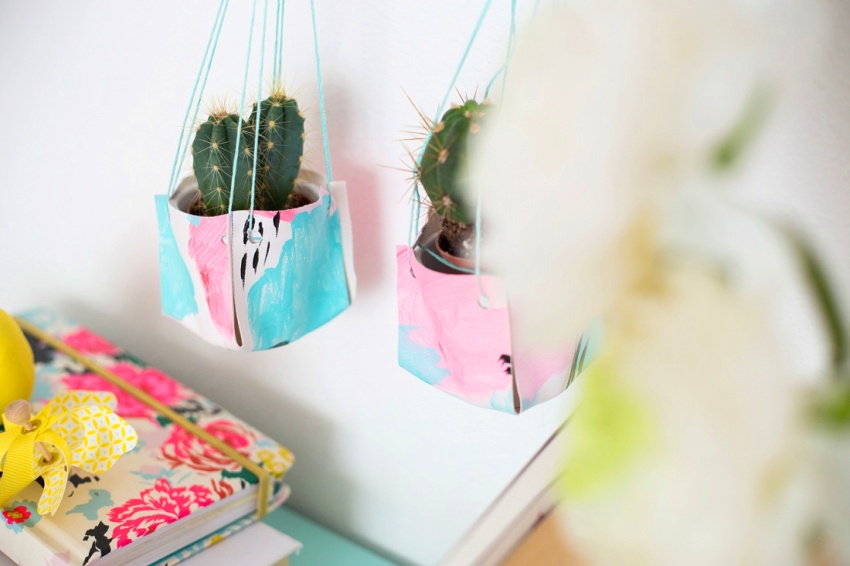 Sebaik sahaja kulit kering sepenuhnya dan mengambil bentuk yang ditentukan, lubang harus dibuat di bahagian atas produk pada empat titik pada jarak yang sama antara satu sama lain. Masukkan sepotong tali ke dalam setiap sel dan ikat simpul dari bawah. Tali boleh dihiasi dengan pelbagai manik, jumbai, paku keling. Di bahagian atas, tali ditarik bersama dan diikat menjadi simpul. Pot bunga diletakkan di penanam yang disiapkan dan digantung di cangkuk.