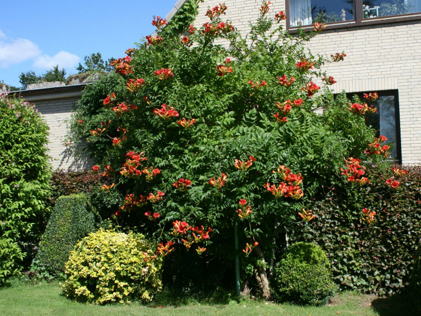 Tanaman anggur Kampsis tumbuh dengan cepat, jadi lebih baik jangan menanamnya tepat di depan tingkap rumah
