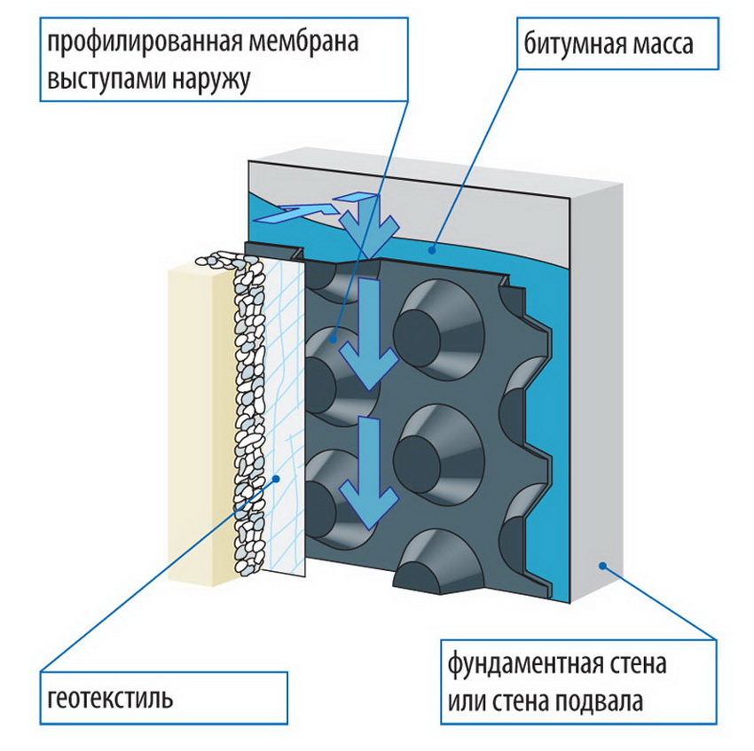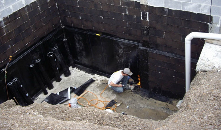 Nasihat berguna! Untuk mengelakkan penembusan kapilari kelembapan ke ruang bawah tanah, disarankan untuk menggunakan kalis air mendatar dalam kombinasi dengan perlindungan menegak. Yang terakhir ini dipenuhi sebahagiannya. Untuk melakukan ini, dinding harus diproses hingga ketinggian sekurang-kurangnya 30 cm.