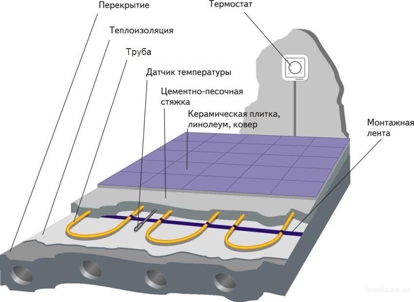 Paip diletakkan di alur dan ditutup dengan polietilena berbuih, pra-menekan. Kemudian papan lapis diletakkan sebagai tingkat bawah. Jelas sekali, kaedah ini tidak begitu sesuai untuk meletakkan jubin sebagai topcoat. Dalam kes ini, anda masih perlu membuat lapisan untuk pelekat jubin yang lebih baik.