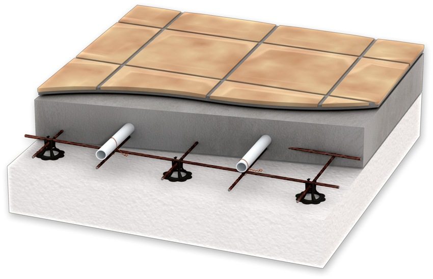 - Sekiranya tidak ada penembusan, maka anda boleh membuat screed. Untuk ini, konkrit M300 digunakan. Ketebalan lapisan di atas paip mestilah lebih dari 3 cm.