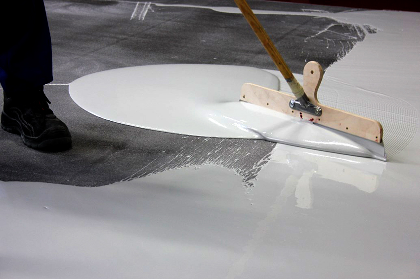Semua komponen cat mesti dicampurkan dengan teliti sebelum digunakan. Pengambilan campuran dilakukan dengan roller terus dari cat mandi. Anda boleh mencurahkan sebilangan komposisi ke lantai dan menyebarkannya secara merata menggunakan roller yang sama. Sekiranya asas konkrit disiapkan dan disusun dengan teliti, ia tidak akan menyerap cat yang berlebihan.