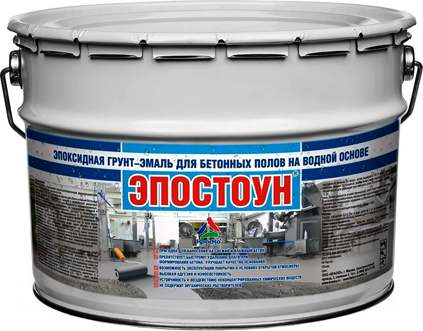Epostone adalah enamel epoksi berasaskan air dua komponen. Asas berpigmennya terdiri daripada resin epoksi dan pengisi denda. Proses pempolimeran dimulakan dengan pengeras amina. Dalam komposisi enamel ini tidak ada pelarut organik, yang mana pengeluar berjaya memperoleh cat lantai yang tidak berbau.