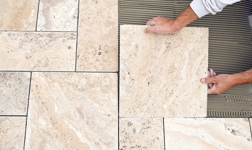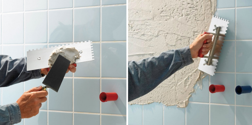 - Spatula halus pelekat jubin digunakan pada bahagian belakang jubin, setelah itu komposisi diratakan ke seluruh permukaan dan alur khas dibuat di atasnya dengan menggunakan kulir yang tidak bertali. Secara sederhana, pada tahap ini, jubin diletakkan sesuai dengan teknologi standard.