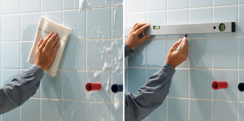 Jika tidak, jubin diletakkan dengan cara standard secara beransur-ansur di bahagian kecil dinding. Ini disebabkan oleh kadar pengeringan pelekat yang tinggi. Unsur-unsurnya dibentangkan di area seluas 1-1,5 m² dan ditekan dengan sedikit usaha. Sehingga lem mengeras sepenuhnya, beberapa penyelewengan dan ketidaksempurnaan dapat diperbaiki dengan menggunakan getah palu.