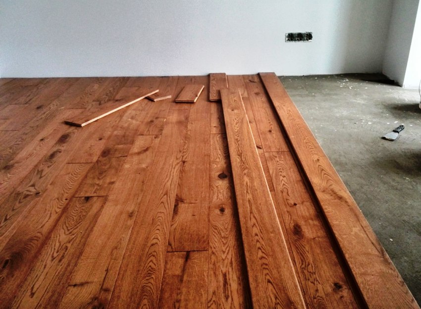 Pilihan termudah dan paling murah, yang sering dilakukan di apartmen, adalah pemasangan lantai kayu di atas konkrit. Penutup hanya diletakkan di atas pangkalan konkrit rata.